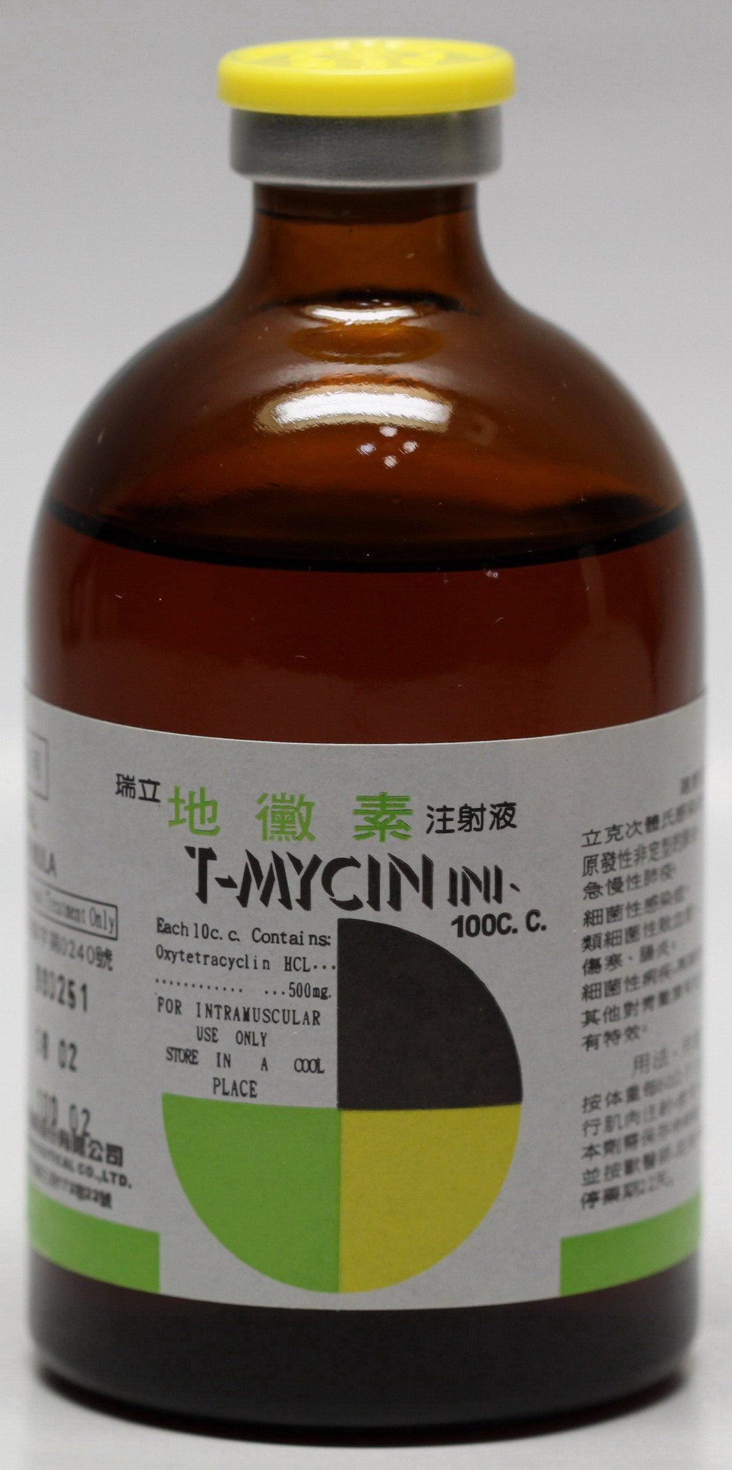 ※本處方限由執業獸醫師(佐)監督之下使用。 Each mL contain: Oxytetracycline HCl 50mg(pot.) 用途: 治療立克次氏感染症、沙門氏感染症